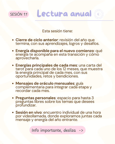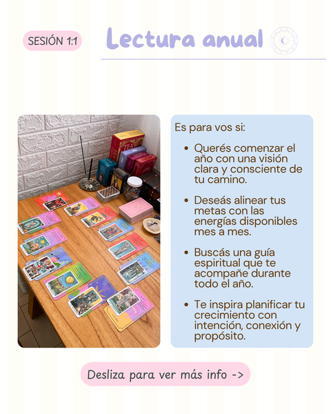 Una sesión de varias lecturas personalizadas para que cierres tu año con conciencia y comiences el nuevo con claridad, dirección y propósito, preparada para todas las oportunidades que se presenten ✨️